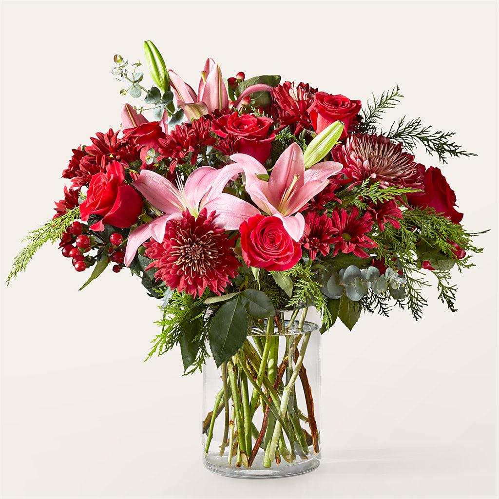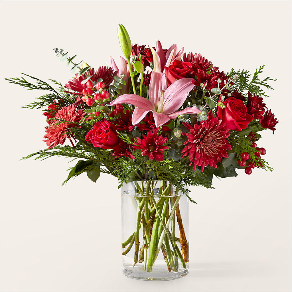 This gift arrives at their doorstep blooming with red mums, daisies, and pink lilies to make their day as sweet as your favorite Christmas cookies.
